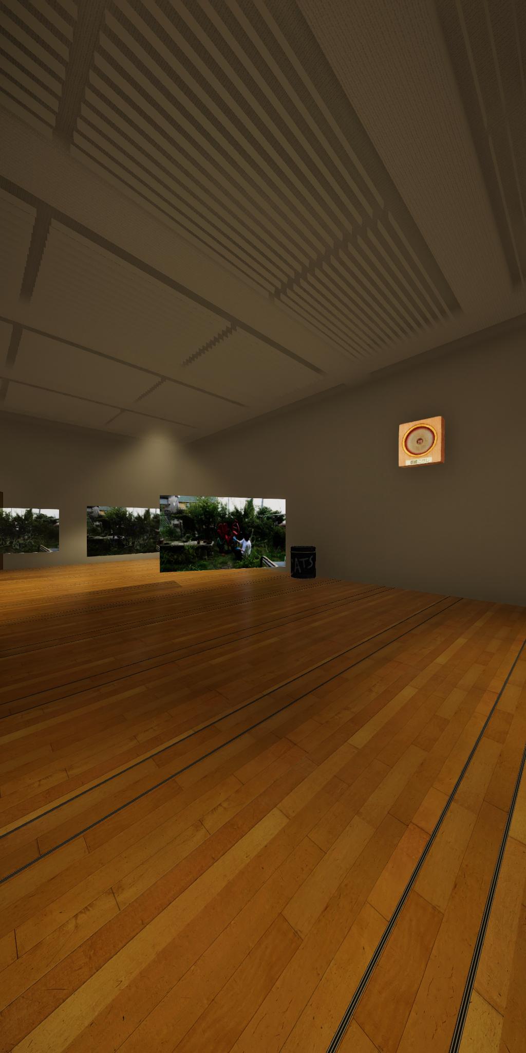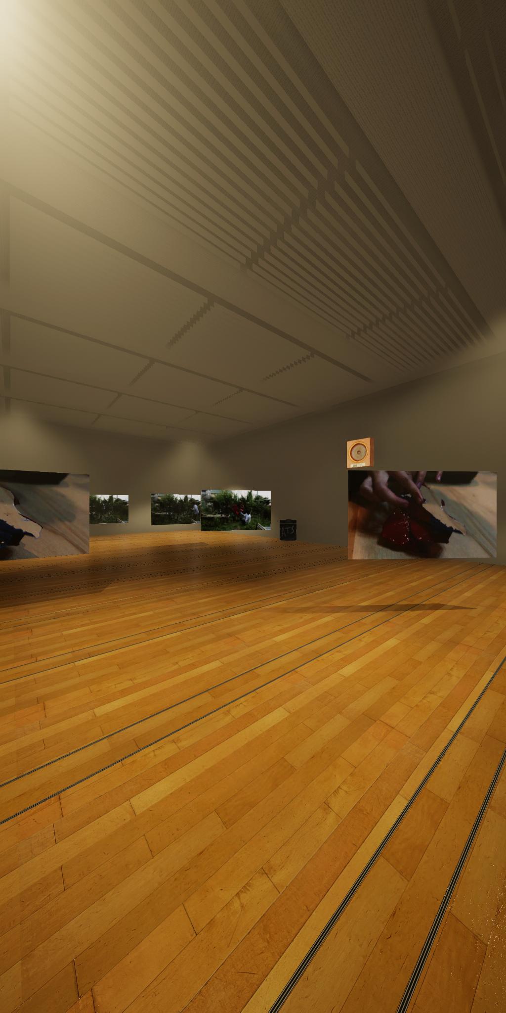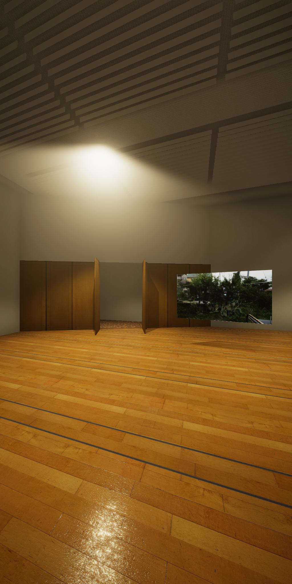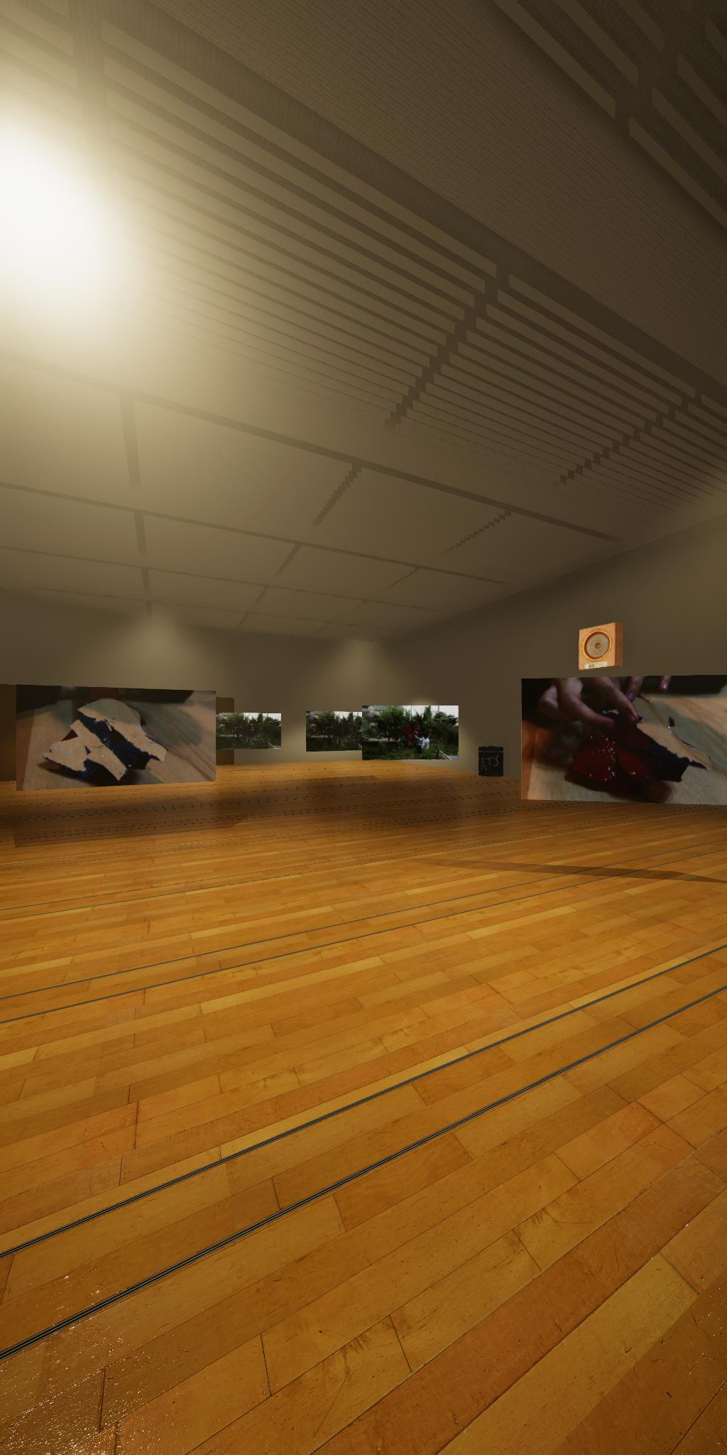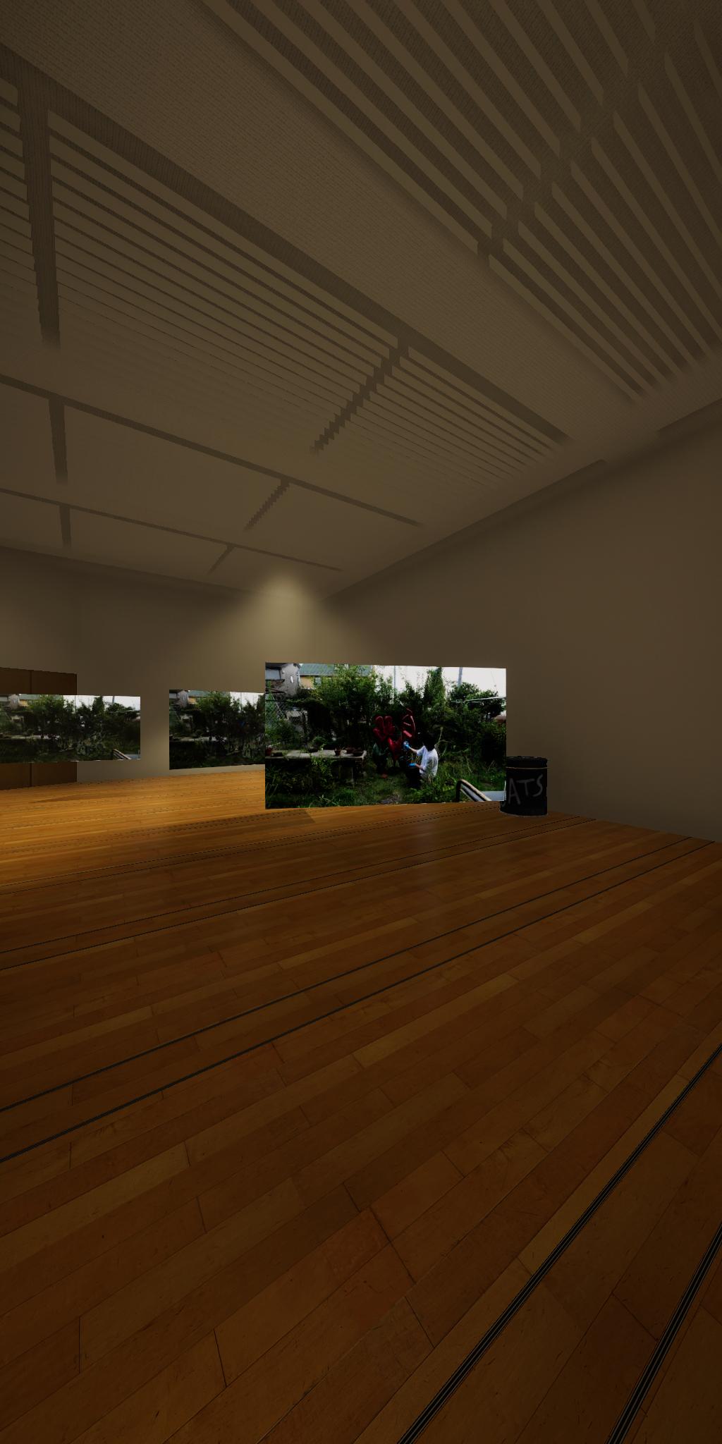 会場に設置された青色をした彫刻が,映像では,なにもない会場とクロマキー合成され,その形を消滅させてしまう作品です.実体としての彫刻が透明になって,展覧会場にある実際の彫刻とは異なる容態で,インターネット配信されます.現実の彫刻の姿は会場に足を運ばないと見ることができません.彫刻という,一般的には現実空間に形をもった立体物として存在する表現形式が,インターネット以降の環境における,多様な鑑賞環境の中でどのように展開可能かを考えます.
