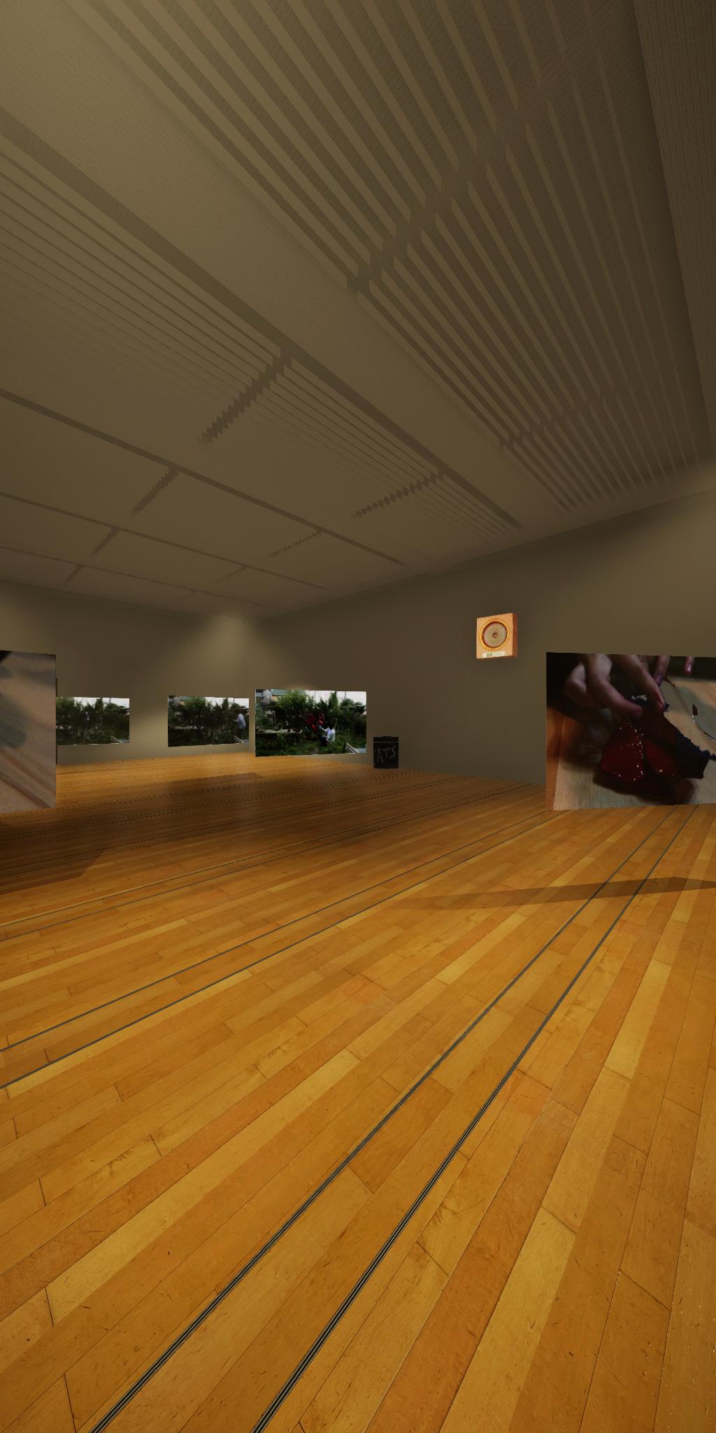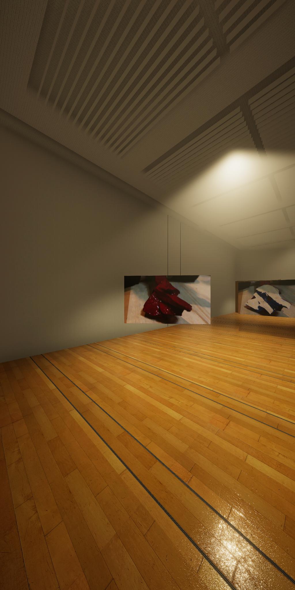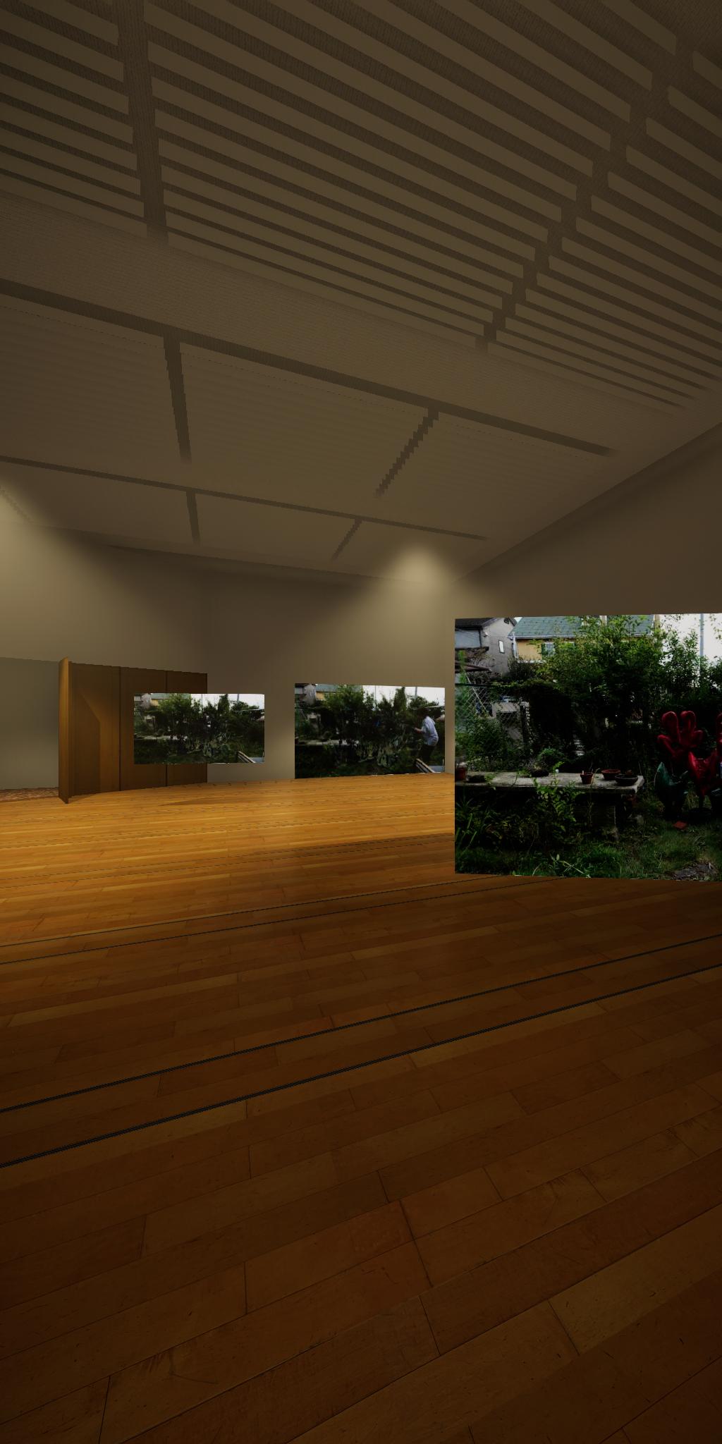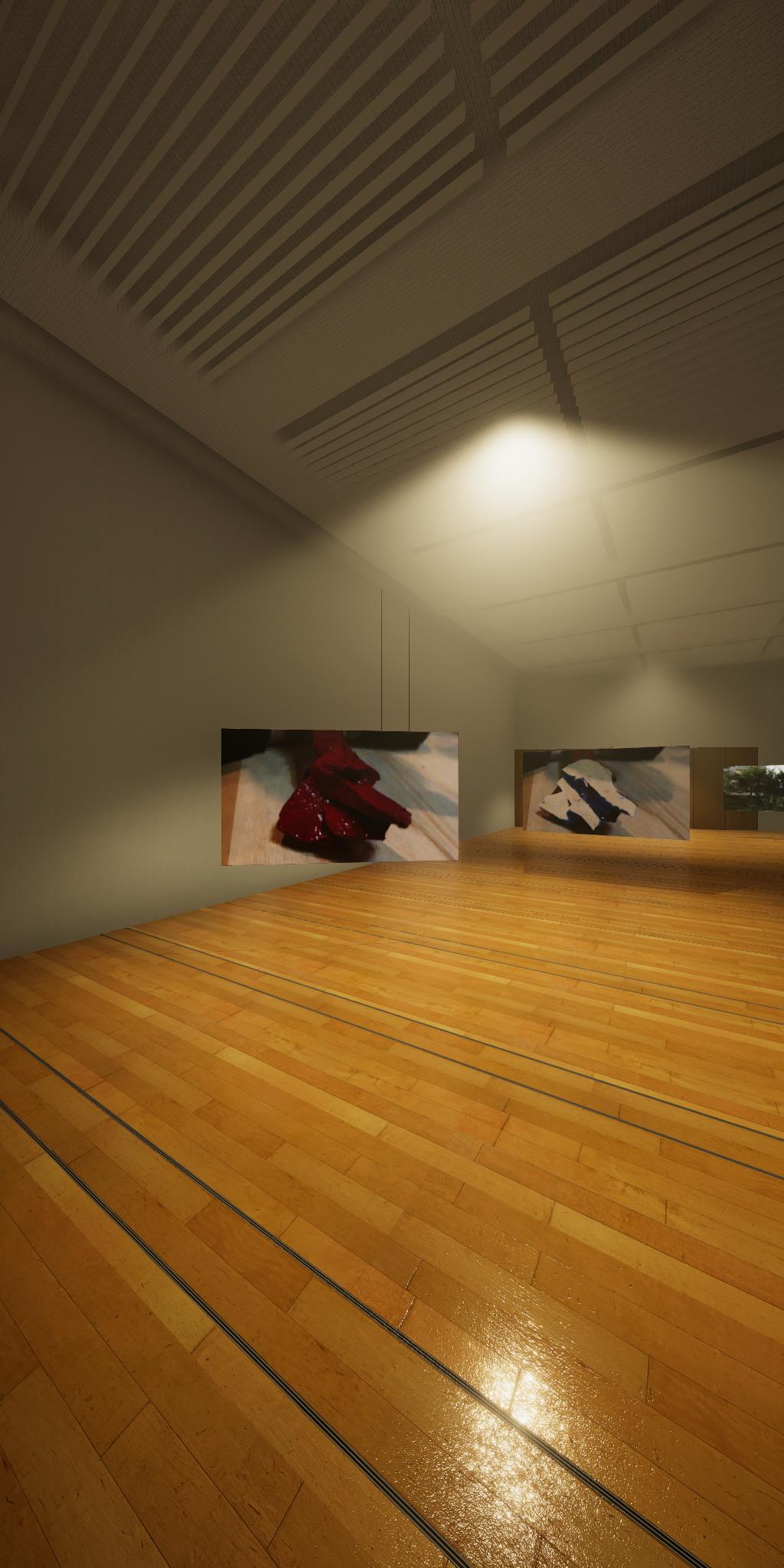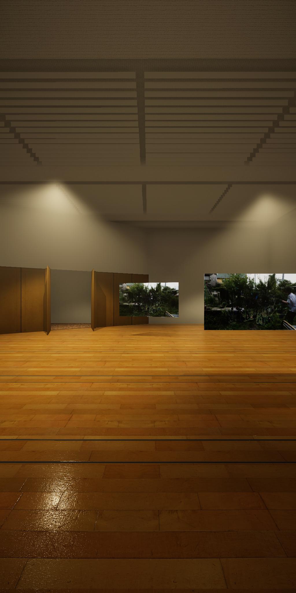 会場に設置された青色をした彫刻が,映像では,なにもない会場とクロマキー合成され,その形を消滅させてしまう作品です.実体としての彫刻が透明になって,展覧会場にある実際の彫刻とは異なる容態で,インターネット配信されます.現実の彫刻の姿は会場に足を運ばないと見ることができません.彫刻という,一般的には現実空間に形をもった立体物として存在する表現形式が,インターネット以降の環境における,多様な鑑賞環境の中でどのように展開可能かを考えます.