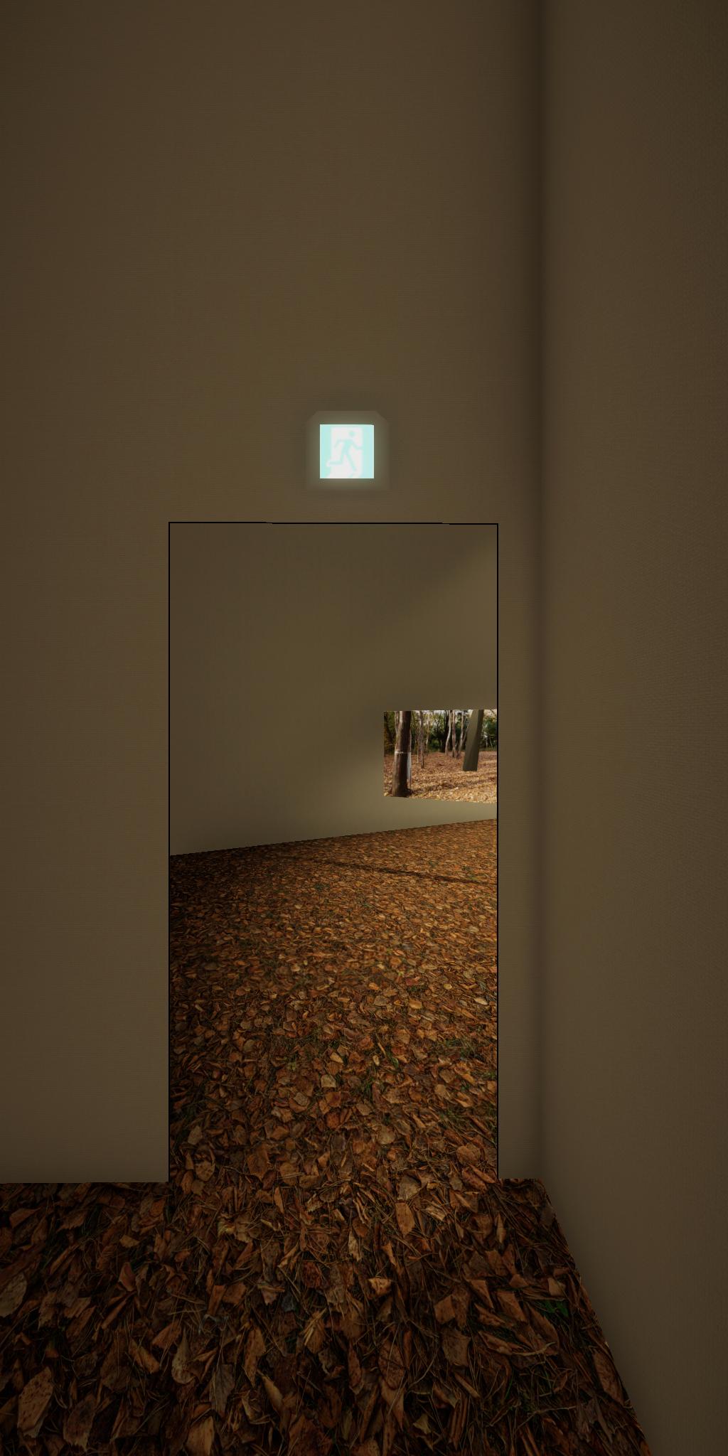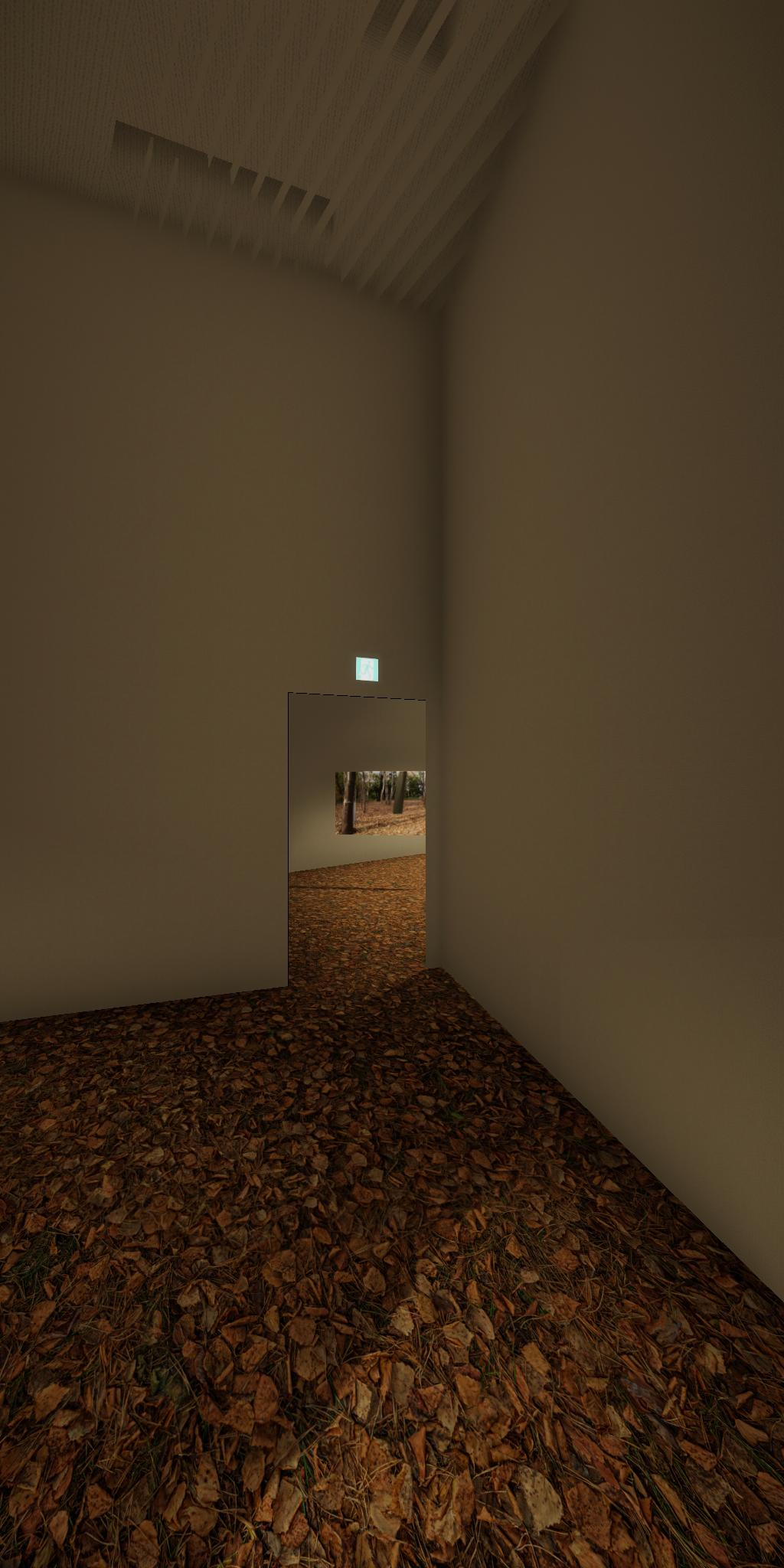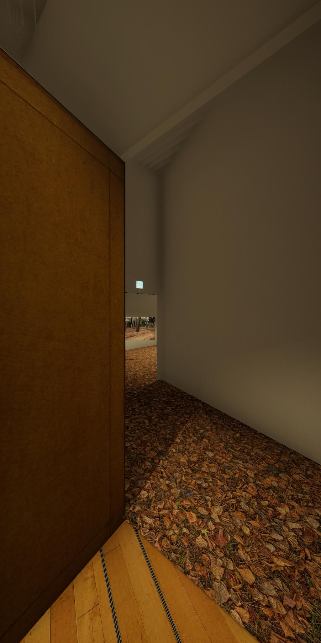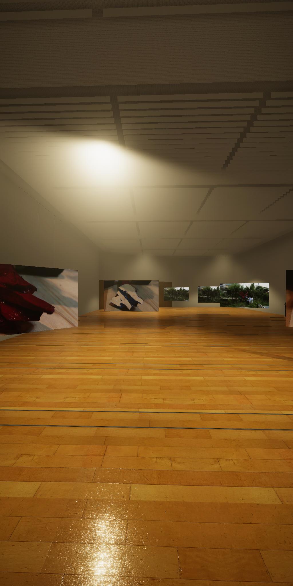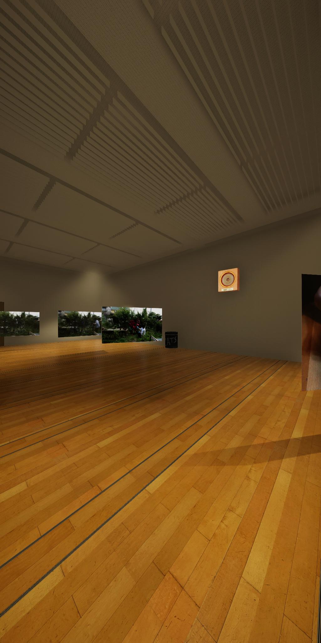 会場に設置された青色をした彫刻が,映像では,なにもない会場とクロマキー合成され,その形を消滅させてしまう作品です.実体としての彫刻が透明になって,展覧会場にある実際の彫刻とは異なる容態で,インターネット配信されます.現実の彫刻の姿は会場に足を運ばないと見ることができません.彫刻という,一般的には現実空間に形をもった立体物として存在する表現形式が,インターネット以降の環境における,多様な鑑賞環境の中でどのように展開可能かを考えます.