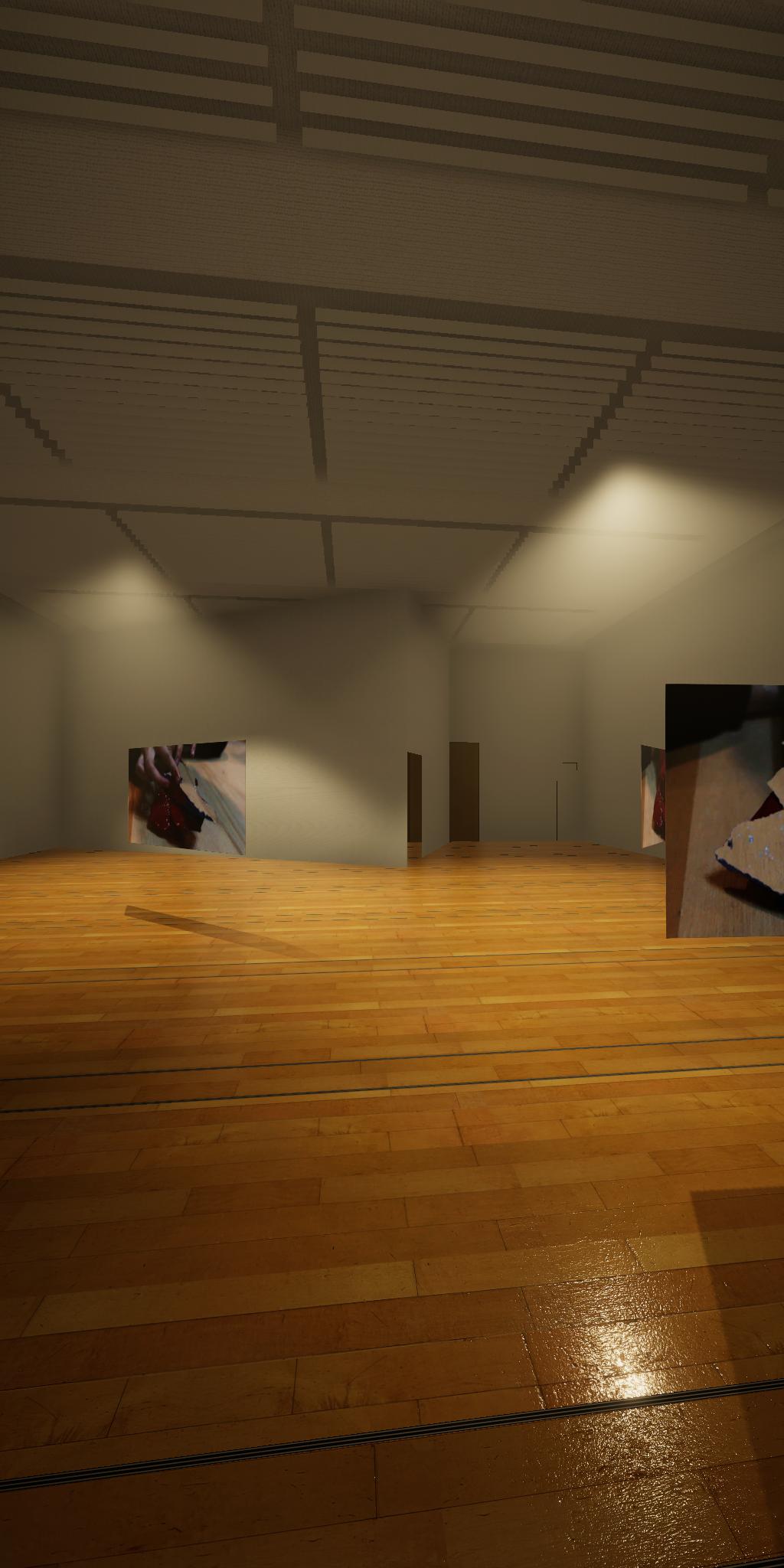 会場に設置された青色をした彫刻が,映像では,なにもない会場とクロマキー合成され,その形を消滅させてしまう作品です.実体としての彫刻が透明になって,展覧会場にある実際の彫刻とは異なる容態で,インターネット配信されます.現実の彫刻の姿は会場に足を運ばないと見ることができません.彫刻という,一般的には現実空間に形をもった立体物として存在する表現形式が,インターネット以降の環境における,多様な鑑賞環境の中でどのように展開可能かを考えます.