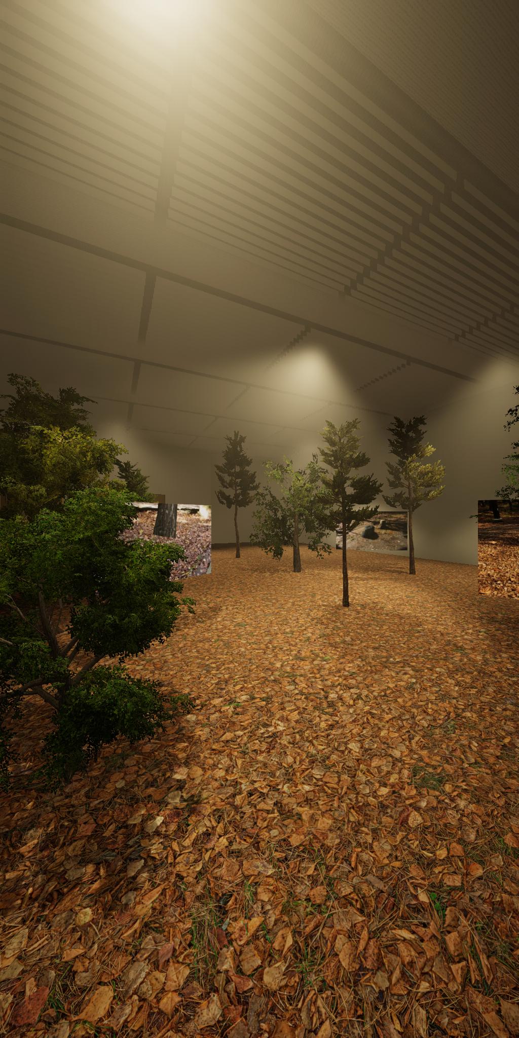 ゲーム空間における植物のリサーチにもとづいて制作された作品です.本作は,実際に公園や渓谷などを散策して,現実の植物の植栽を撮影し,ゲーム内のヴァーチュアルな植物を生やす余地がありそうな場所に,付近の植物と似たような形状の植物をゲーム世界や3Dモデルのアセットから探し,植えるというプロセスで制作されています.たかはしは,現実世界における整備された庭や公園とゲーム世界の植栽の関係などを考察し,そこに関連を見出しています.